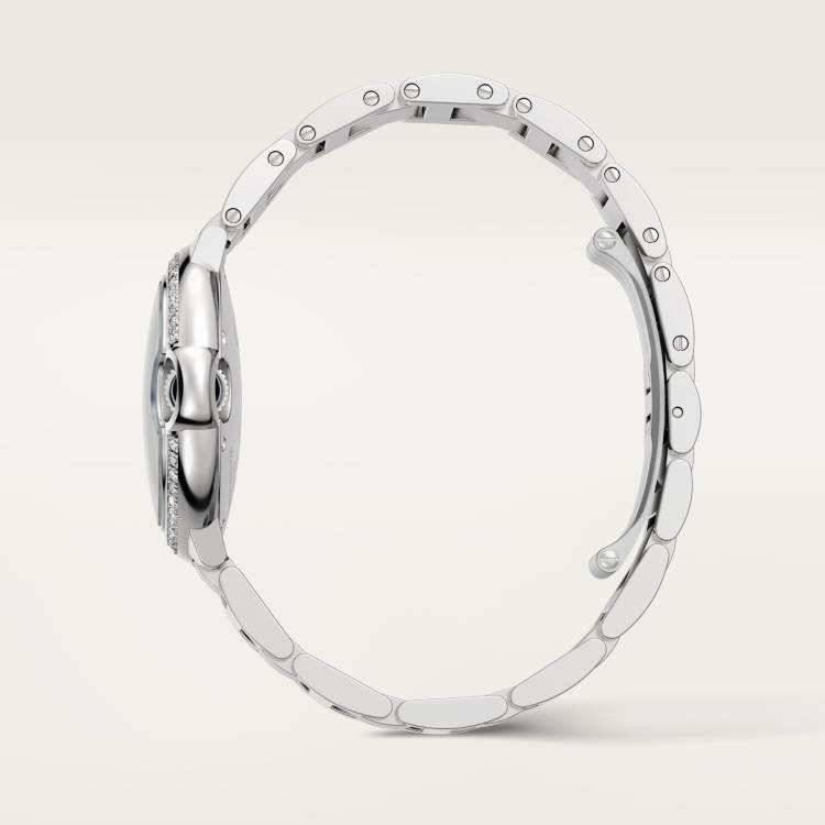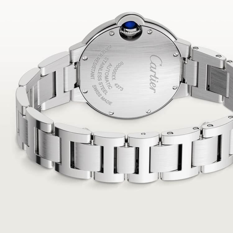 Ballon Bleu de Cartier watch, 33 mm, automatic mechanical movement. Stainless steel case, fluted crown, set with a synthetic cabochon spinel, stainless steel bezel set with 50 brilliant-cut diamonds totaling 0.58 carats, blue silvered sunray-patterned frosted dial, sword-shaped blue steel hands, synthetic sapphire crystal, interchangeable stainless steel bracelet. Thickness: 10.16 mm. Water-resistant to 3 bar (approximately 30 metres/100 feet).