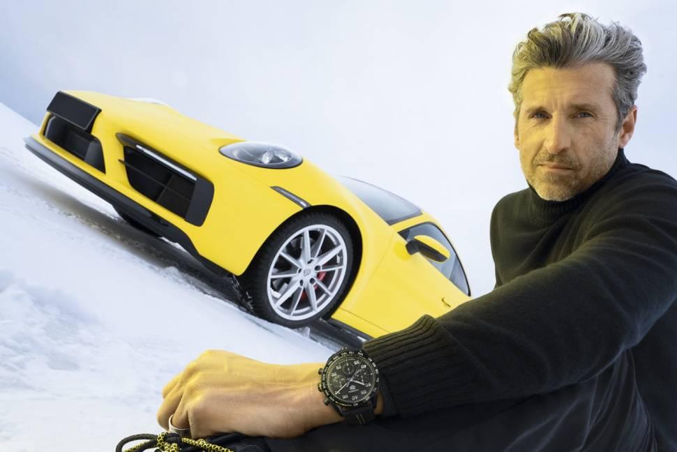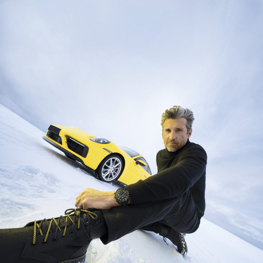 The textured calfskin strap with bold yellow stitching and lining pays homage to Porsche interiors, while the black DLC stainless steel folding clasp matches the case.