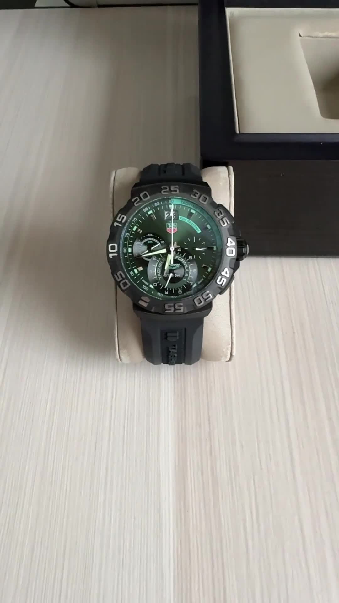 The bright green dial shines brightly, decorated with three subdials and eye-catching hour markers, which are easy to read on and off the track.