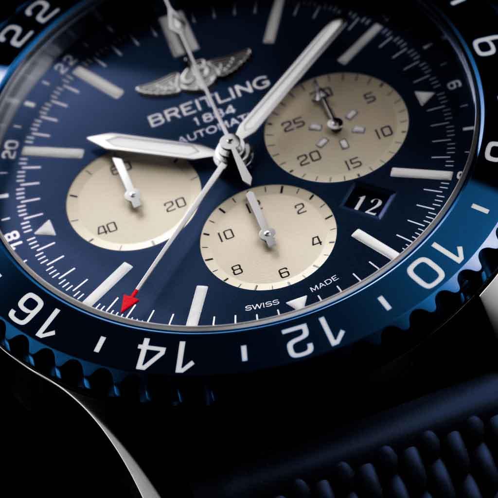 Breitling caliber B04 (base Breitling caliber B01) | Automatic | Frequency: 28,800 vph (4 Hz) | Jewels: 47 | COSC certified | Hours, minutes, small seconds, date, GMT, column-wheel chronograph | Power reserve: 70 hours