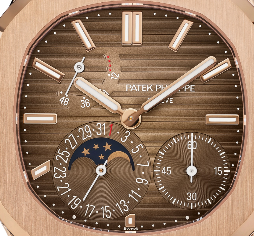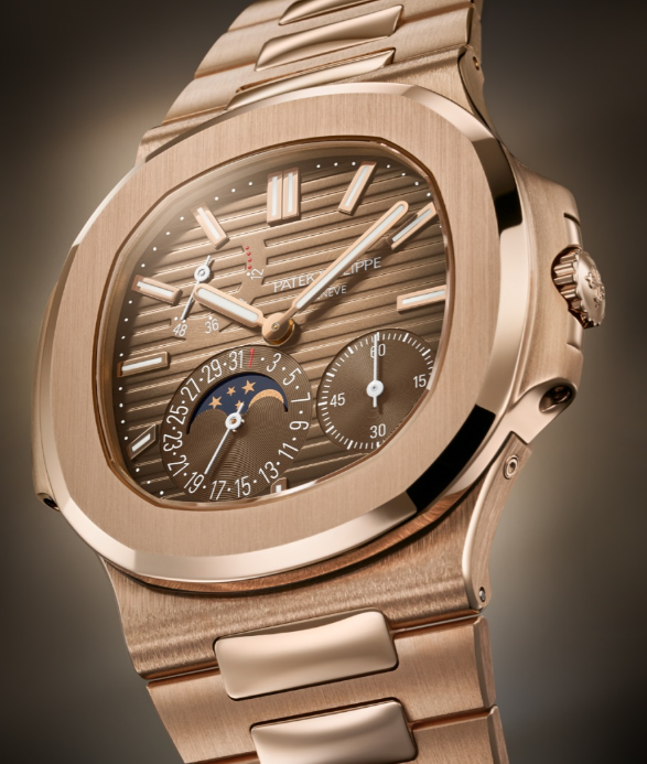 The famous Nautilus watch Ref. 5712/1R-001 features a pointer-type date display, moon phase display and power reserve display, combining sportiness and elegance. This flagship model features a rose gold case and bracelet, with a brown sunburst dial with a gradient black effect.