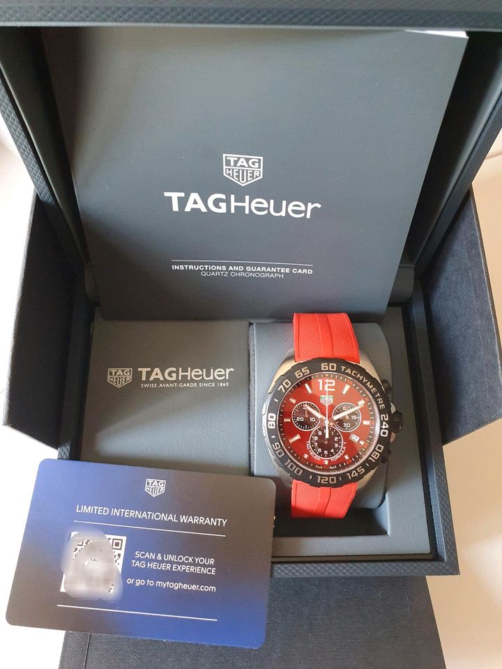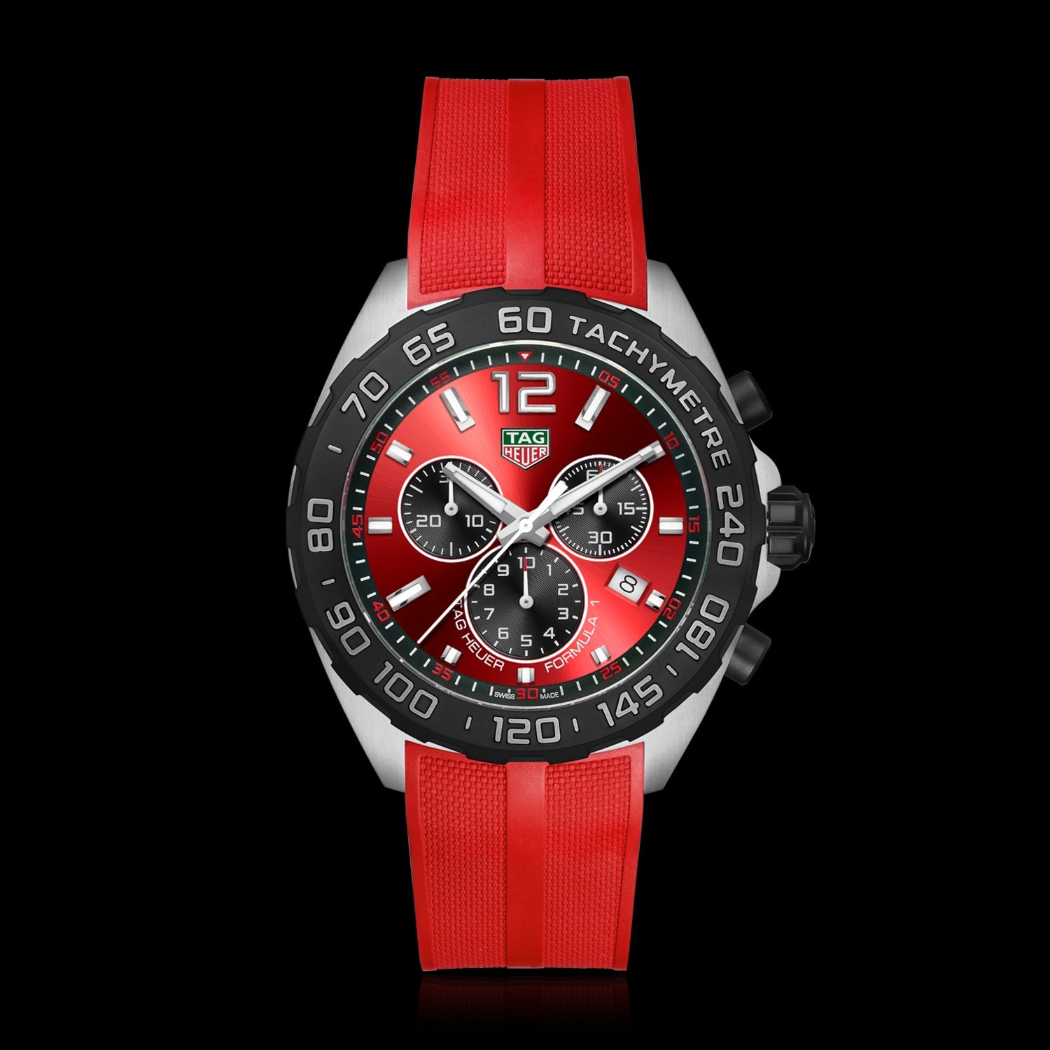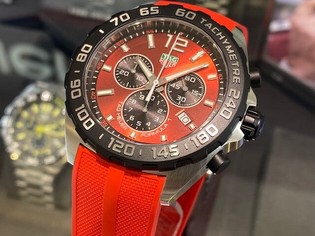 The TAG Heuer Formula 1 Chronograph interprets the bold spirit of racing with a harmonious combination of red and stainless steel.  The vibrant red, sun-polished dial makes this model stand out and stand out from the crowd.