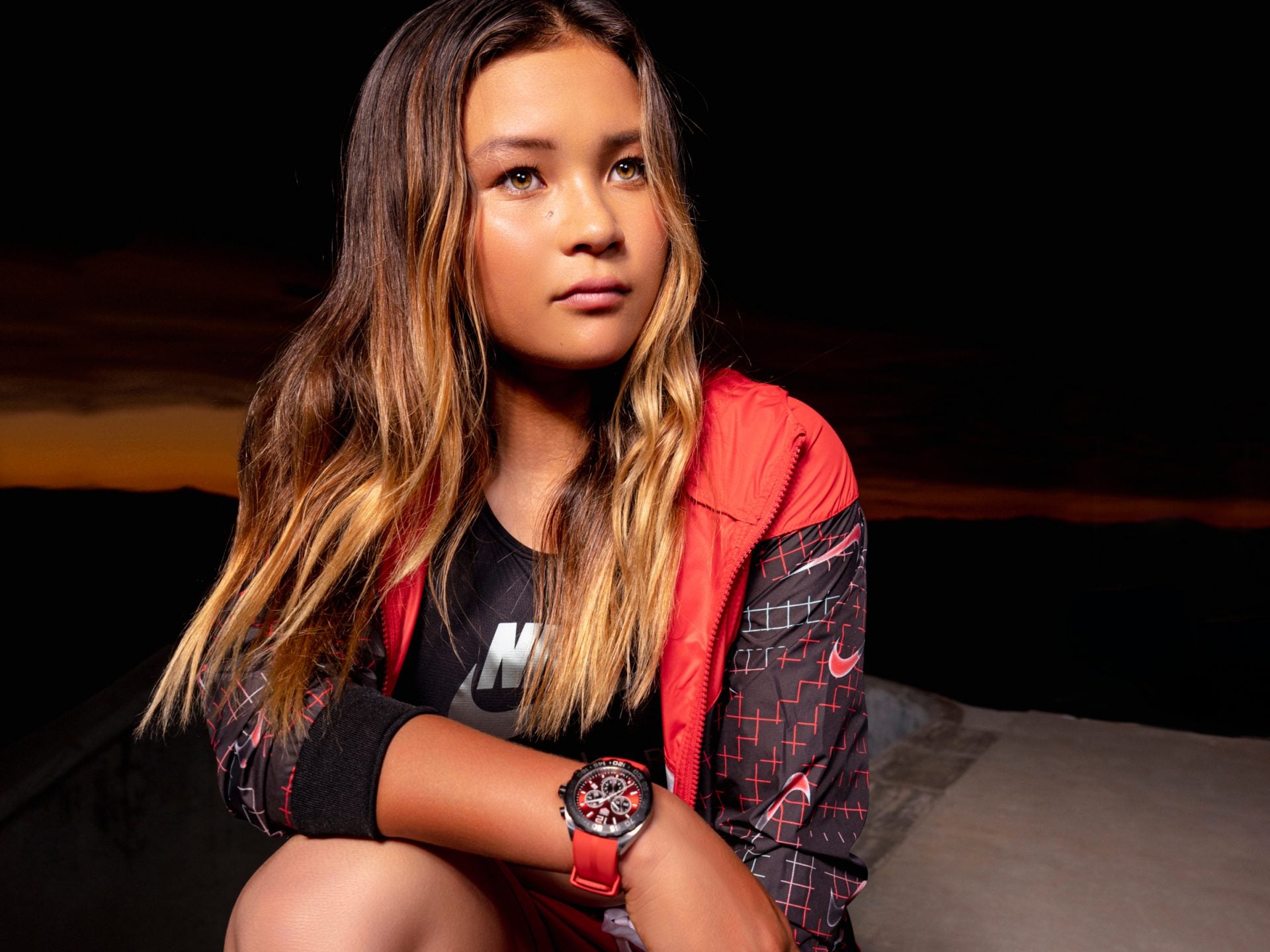 Immerse yourself in a fiery red sun-brushed dial embellished with three black sky-blue finished subdials and ultra-legible Super-LumiNova® hands and hour markers.