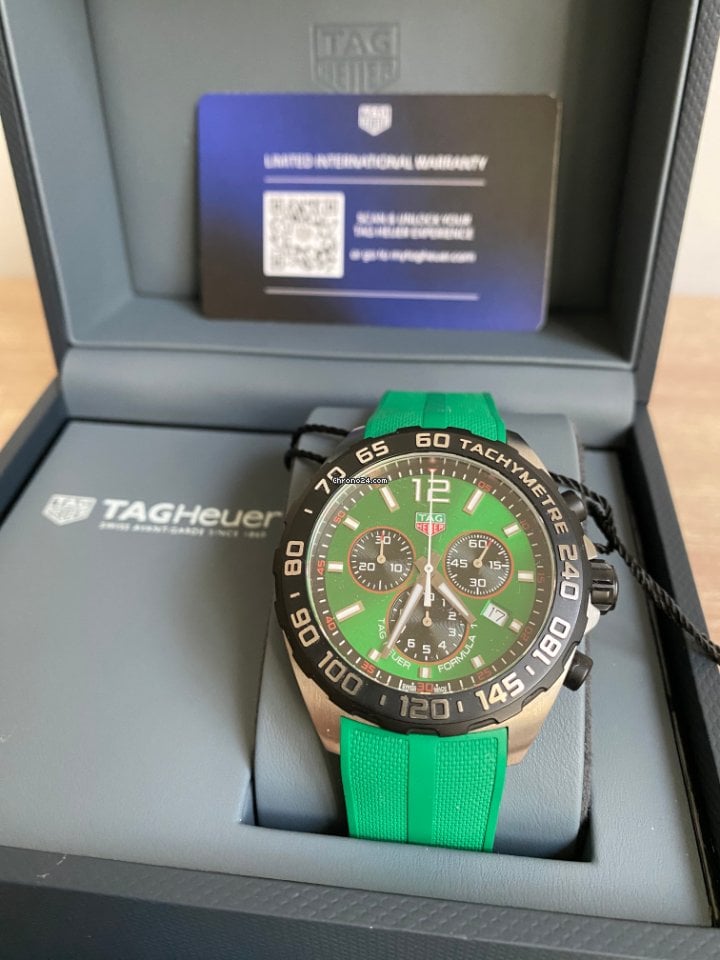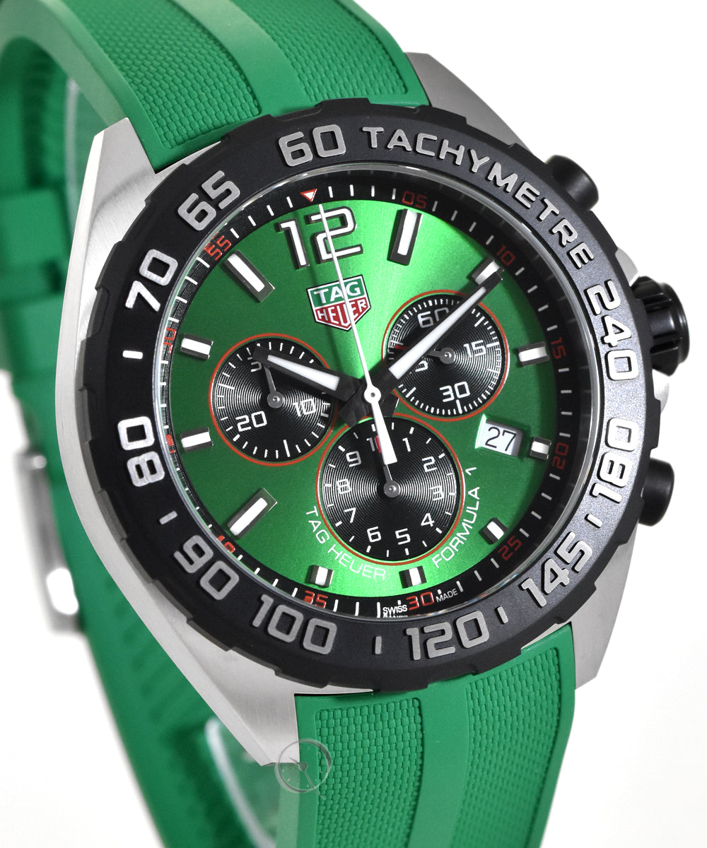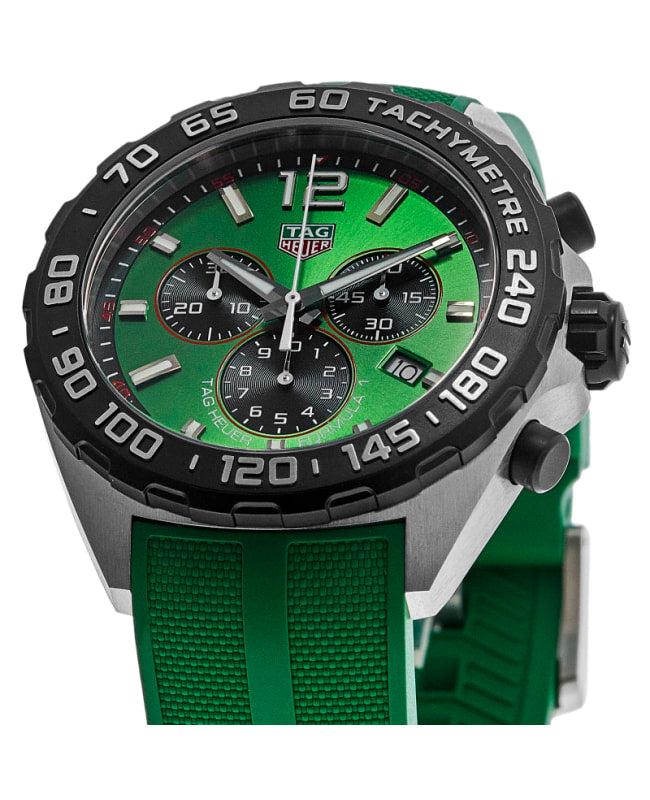 The vibrant and energetic TAG Heuer Formula 1 is perfect for a fast-paced life. The green sun-brushed dial and matching strap are ready for the race at any time.