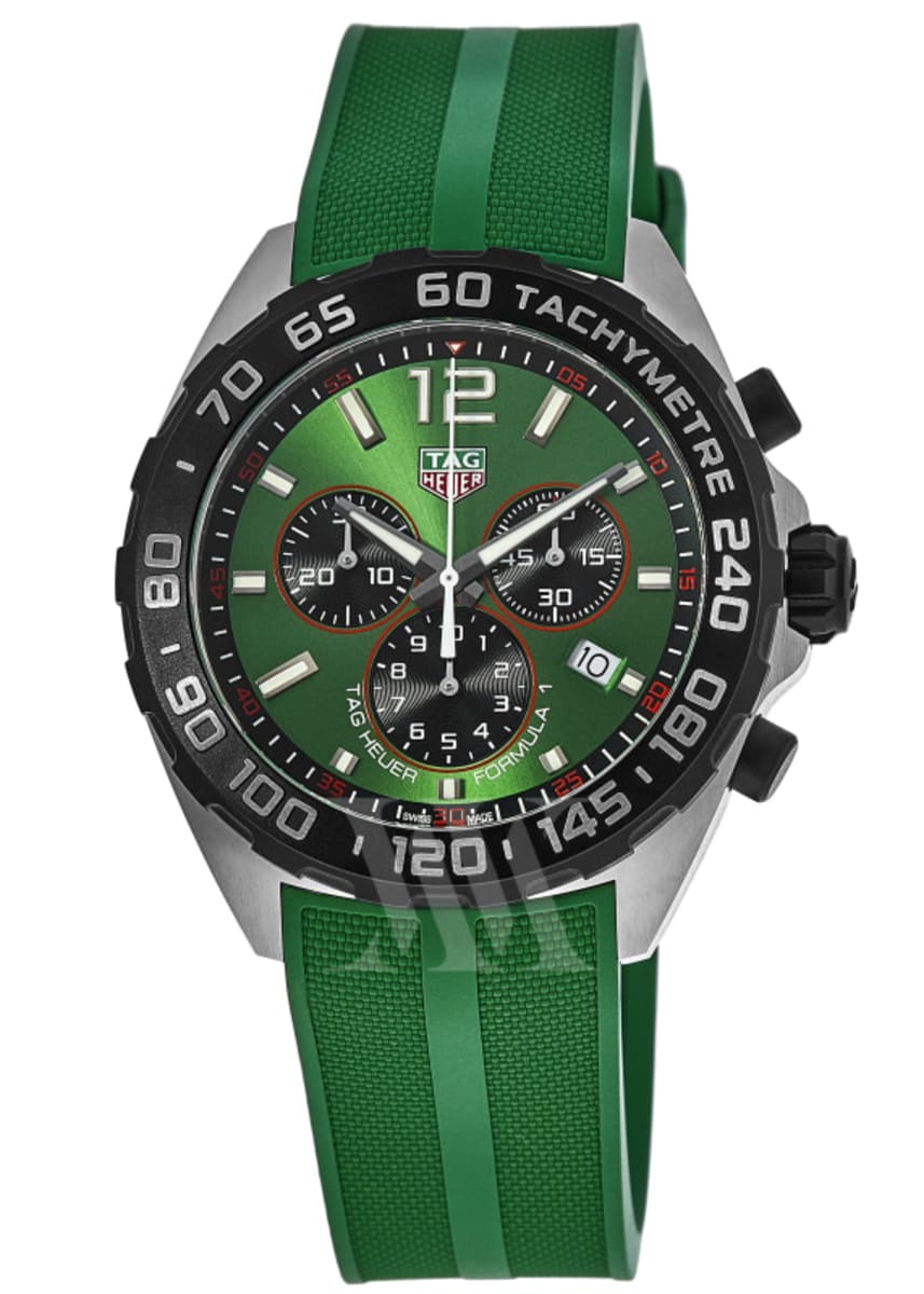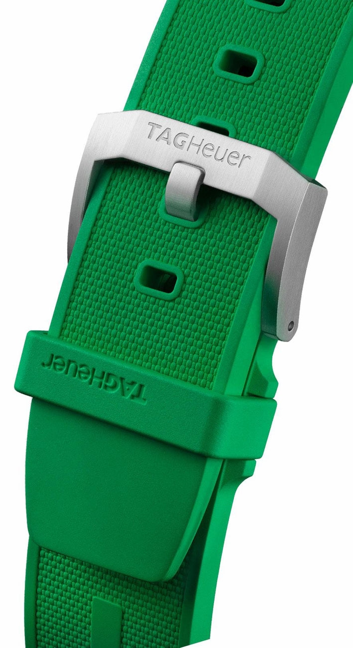 The TAG Heuer Formula 1 sets the trend with color and coolness. This versatile 43 mm chronograph features a vivid green dial and matching rubber strap, full of sporty design elements, and the racing series is heading towards victory.