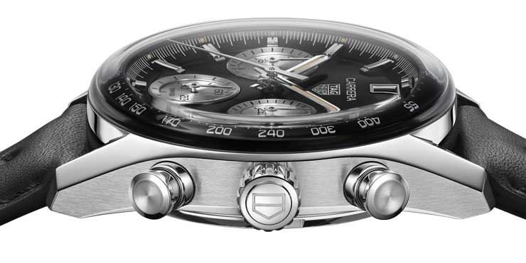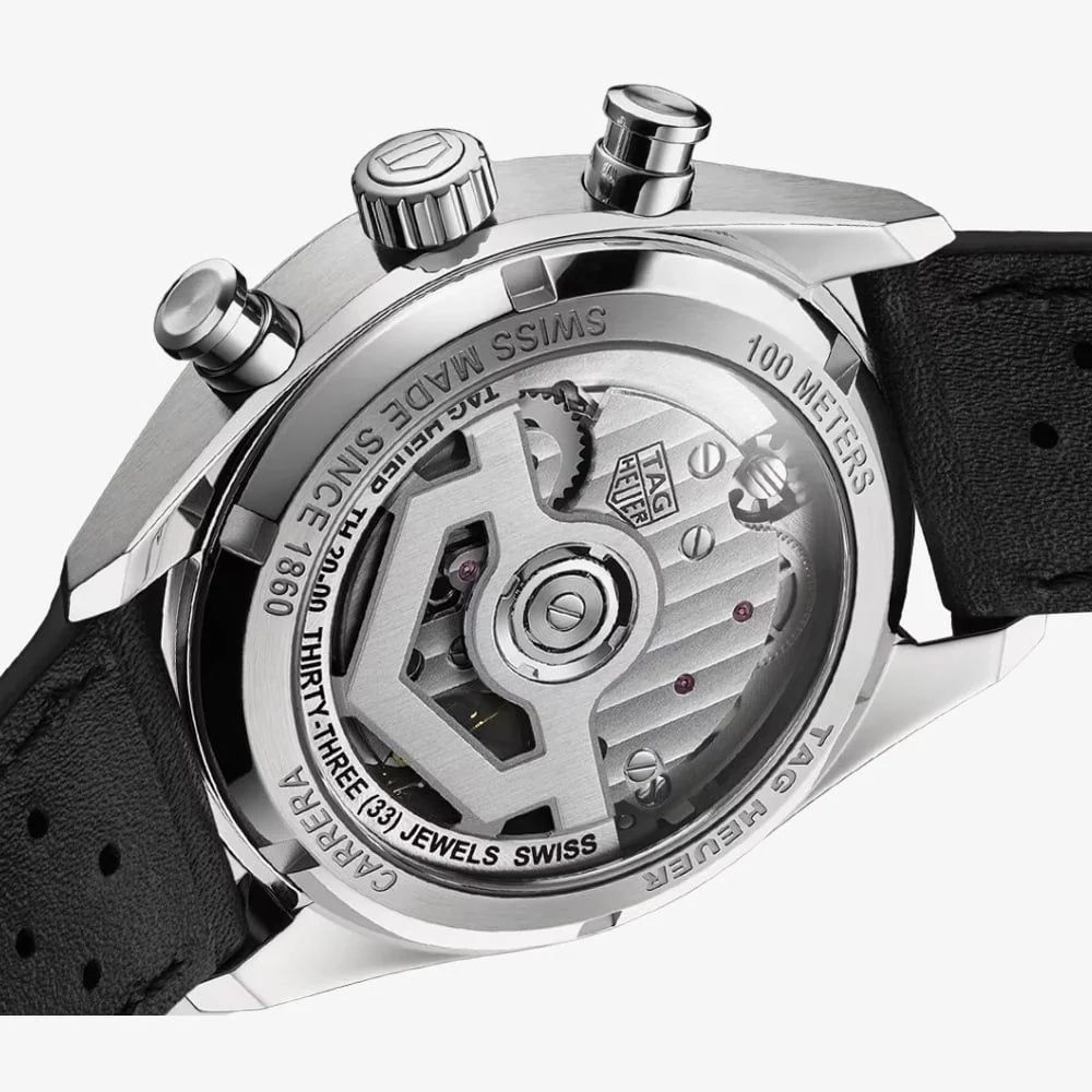This black 2447mm version of the prestigious TAG Heuer glass case is redesigned based on the reverse Panda 39 NS model, interpreting the Carrera's iconic design in a modern style. Paired with a luxurious perforated calfskin strap, This watch is resolutely driven by daring.