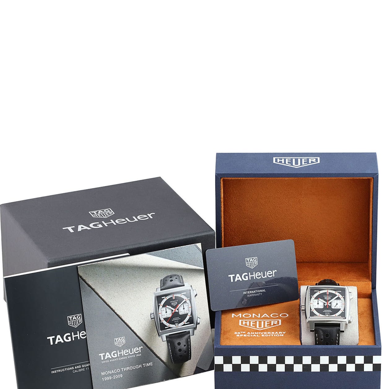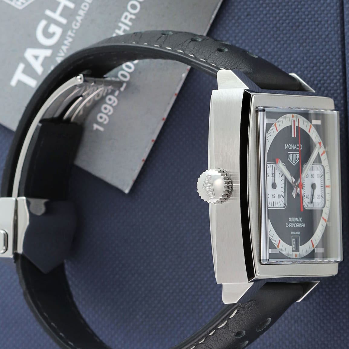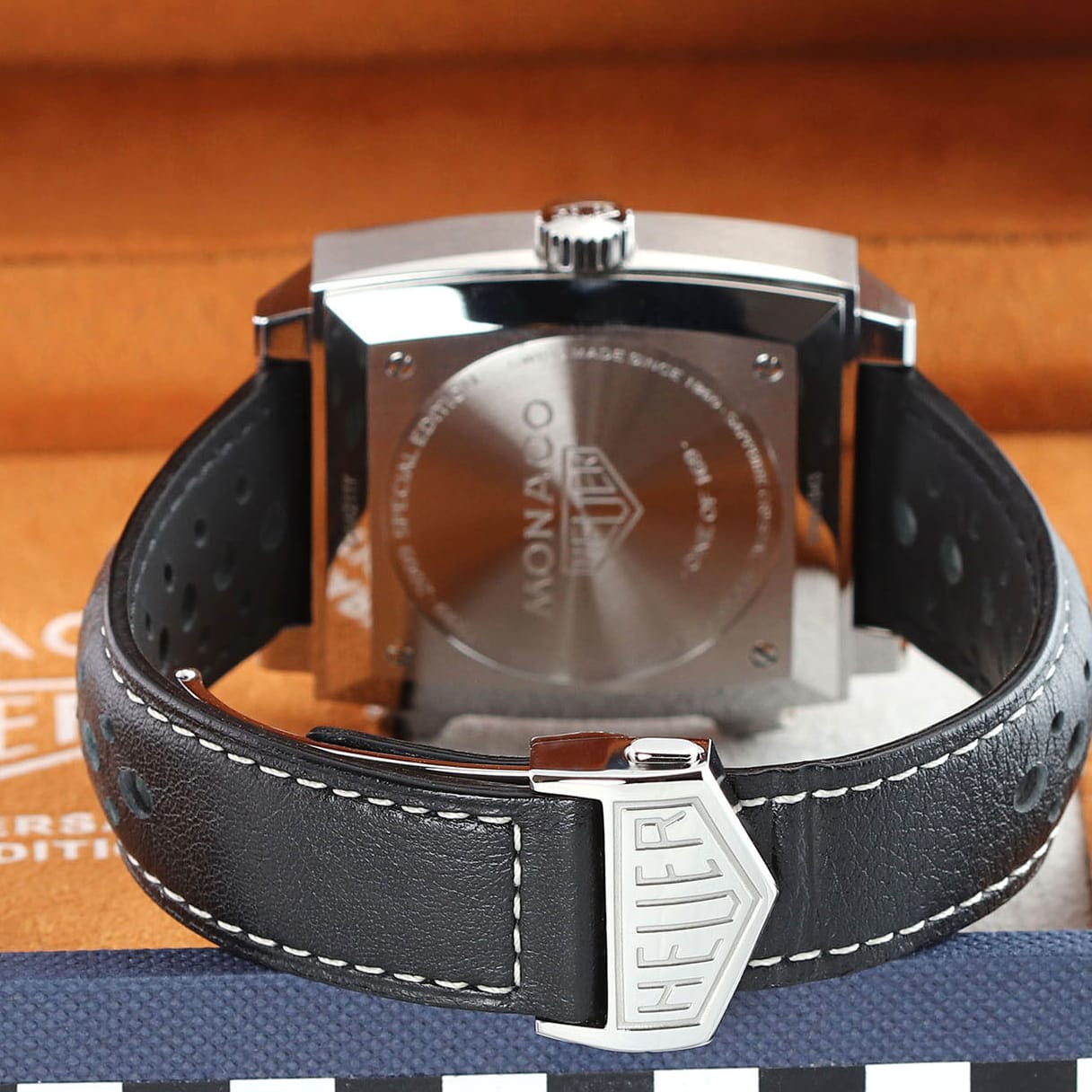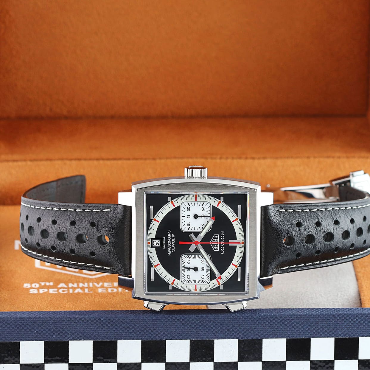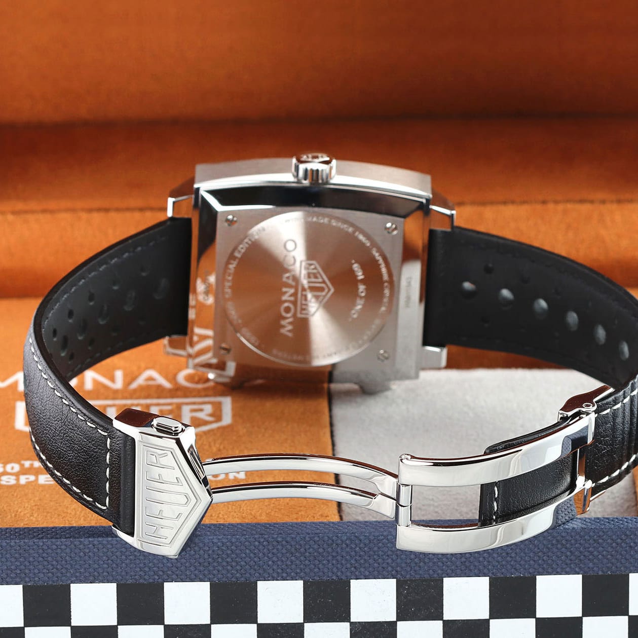 Strap: Fitted on its original TAG Heuer black perforated calfskin strap with orange stitching & lining and a stainless steel push-button deployant buckle.